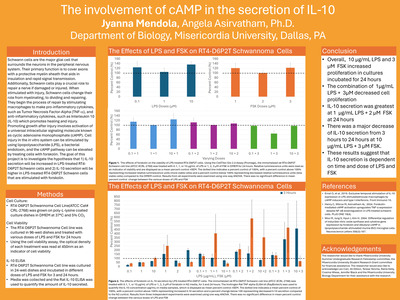 Schwann cells have been found to play a key role in inflammation and repair following nerve injury. During nerve injury, the myelin sheath becomes damaged, stimulating Schwann cells to secrete cytokines and initiate an inflammatory response. They begin the process of repair by stimulating macrophages to make pro-inflammatory cytokines, such as Tumor Necrosis Factor-Alpha (TNF-a), and anti-inflammatory cytokines, such as Interleukin 10 (IL-10) which promotes healing and injury. Although it is clear Schwann cells play a role in nerve repair, there is still yet to be known regarding the exact mechanisms by which they do so. In vitro, Lipopolysaccharide (LPS), can induce systematic inflammation and stimulate the production of inflammatory mediators, like tumor necrosis factor alpha (TNF-α) and Interleukin 10 (IL-10). Reports on LPS-stimulated microglial cells treated with forskolin at various time points revealed an increase in IL-10 mRNA levels. A similar study conducted on LPS-treated RT4-Schwann cell lines that were stimulated with forskolin for 3 hours resulted in the secretion of TNF- α. To further explore the effects of forskolin in LPS-stimulated Schwann cells, the role of IL-10 secretion was examined. It was hypothesized that IL-10 secretion will be increased in LPS-treated Schwann cells and IL-10 secretion will be higher in LPS-treated Schwann cells that are stimulated with forskolin. Cells from the RT4-D6P2T Schwann cell line were treated with 0.1,1, or 10 μg/mL of LPS, or 1, 2, 3 μM forskolin (F), or combinations of LPS and F treatments for 3 and 24 hours in N2 media in a 24 well plate. Using the ELISA, IL-10 secretion, was higher in LPS + F treated cells than in LPS-stimulated or F treated cells only. IL-10 was increased at 1 μg/mL of LPS with all treatments of F at 24 hours (404+/- 231.3%, 586+/-226.2%, 474+/-299.1%). Surprisingly, IL-10 was higher in LPS-stimulated cells at 3 hours with 10 μg/mL of LPS + 3 μM F(462+/-60.35%) than at 24 hours (66+/-66.3%). In summary, it appears as though all the combination treatments of LPS and F factors, may act in unity to upregulate IL-10, while being dependent on time. These findings suggest that, during nerve injury, the cAMP pathway may have the ability to counteract inflammation by secreting IL-10 in LPS-stimulated Schwann cells is dependent on the concentration of and duration. A better understanding of the balance between the pro and anti-inflammatory cytokines during nerve injury may provide more information.