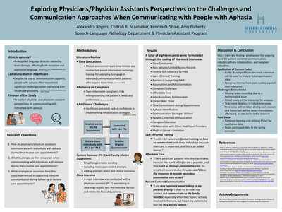 Aphasia is an acquired language disorder that results from damage to the language areas of the brain, typically located within the left hemisphere. Individuals with aphasia often experience significant challenges while communicating with other individuals, including physicians and healthcare professionals. These barriers can ultimately lead to negative impacts on the quality of care, patient experiences, and overall health outcomes. The lack of consistent use of communication strategies as well as a general misunderstanding of aphasia by medical staff, further contributes to communication breakdowns. As a result, medical assessments can be misinterpreted, treatments may be delayed, and patients may feel less involved in their own healthcare decisions. In turn, these barriers to communication may also compromise the patient’s adherence to medical advice, increase the risk of medical errors, and diminish overall satisfaction with care. This study seeks to explore and identify the specific barriers and facilitators that influence communication between patients with aphasia and physicians and physician assistants. Through the Summer Undergraduate Research Fellowship (SURF), literature review was conducted to contextualize existing research. One physician assistant provided consultation on interview design. A mock interview with a practicing physician assistant was then completed, transcribed, and coded using NVivo to establish preliminary themes and assess transcription reliability. Eighteen codes emerged from the analysis. Future phases of this study will expand interviews with practicing physicians and physician assistants to deepen understanding of these dynamics. The ultimate goal is to improving healthcare communication and outcomes for individuals living with aphasia.